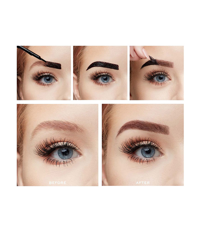 The brow tint comes in three shades dark brown. Brush the gel formula over the brow hair. Apply product to clean brows.